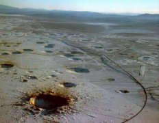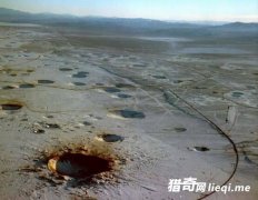 在内华达核试场,试爆了不少原子弹。从此图中,大家可以看到许许多多巨大的弹坑,绝大多数都是原子弹试爆干的。 分页标题 拉斯维加斯离内华达试验场大约105千米,在这里可以看到原子弹爆炸时产生的蘑菇云。图为游客们正在观看1957年6月24日的一次核试...