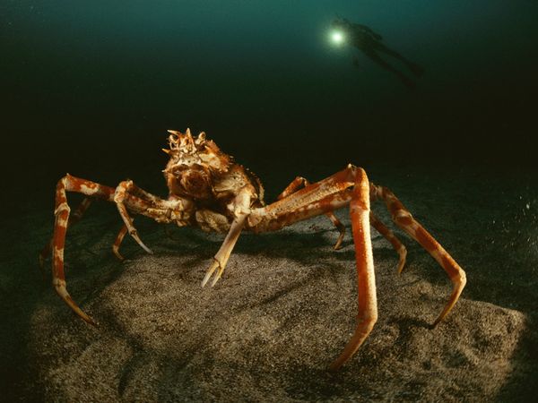 巨型蜘蛛蟹 巨型蜘蛛蟹被认为是地球上最大的节肢动物,它们大部分时间在1000英尺(300米)的海洋底觅食。这种罕见的奇长的庞然大物起源于日本,它从爪尖到爪尖的距离可以宽达12英尺(3.7米)。这个五英尺(1.5米)长的物种拍摄于日本的相模湾。